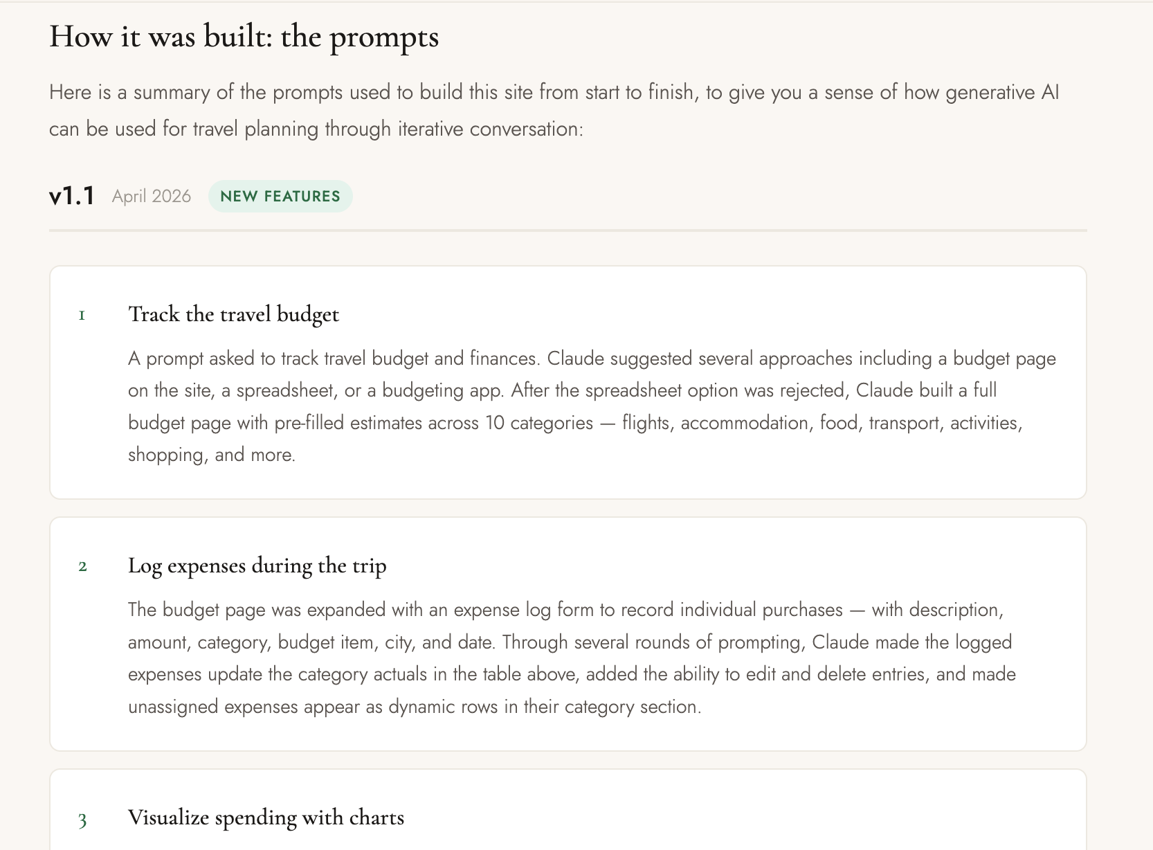 You can see the full summary of all my prompts on the About page of the trip website. (Shown in the style of release notes, with “version” and “release date”).