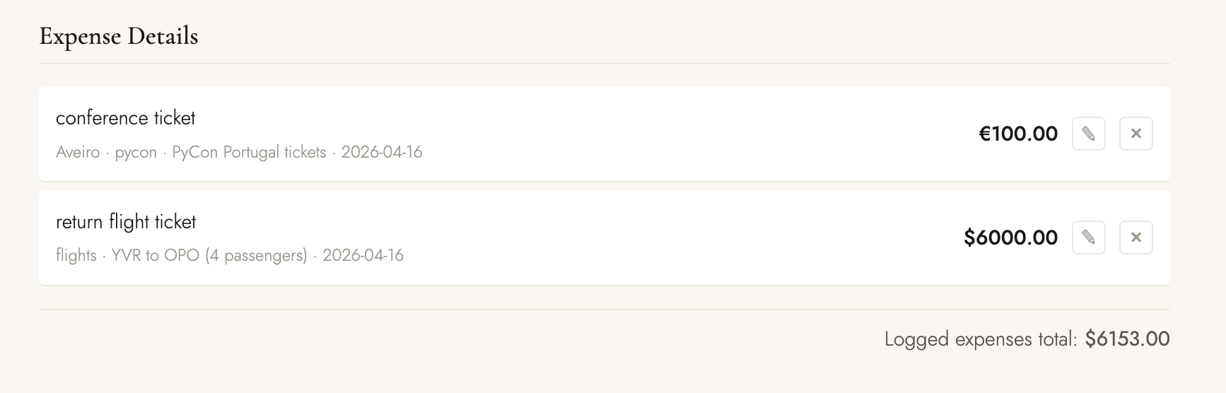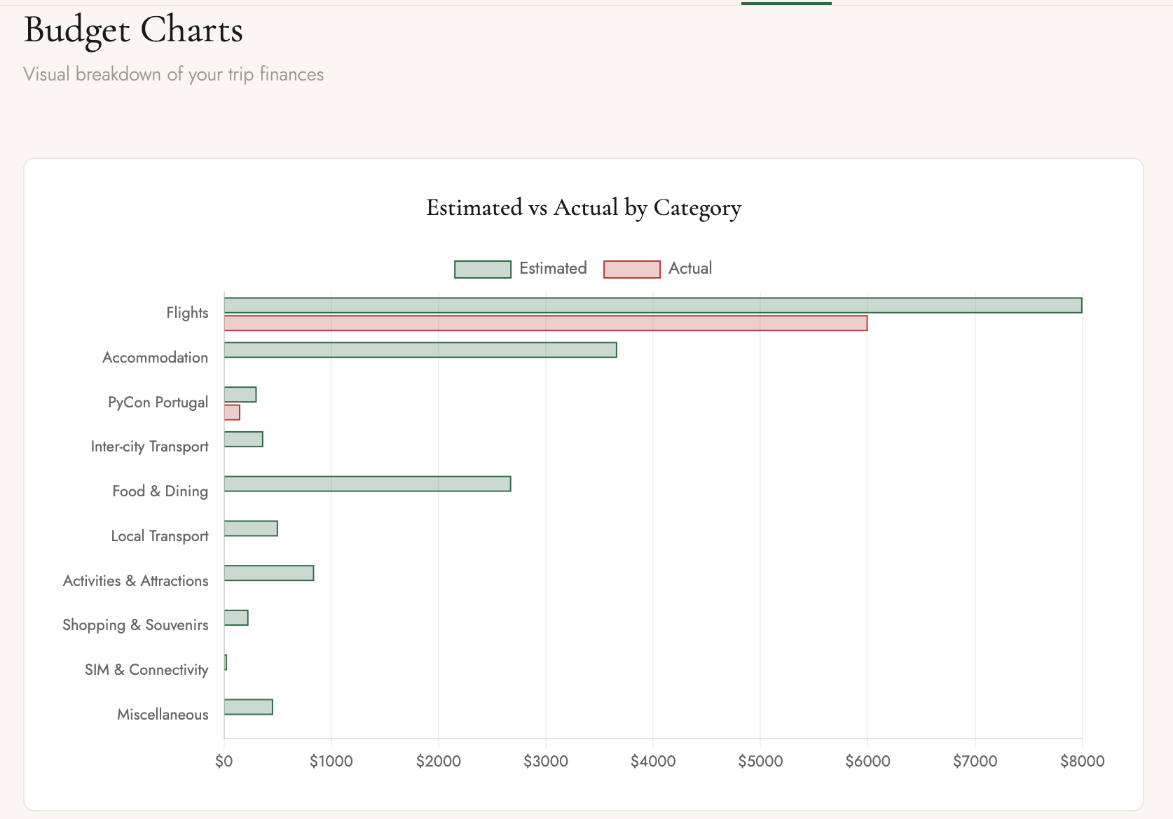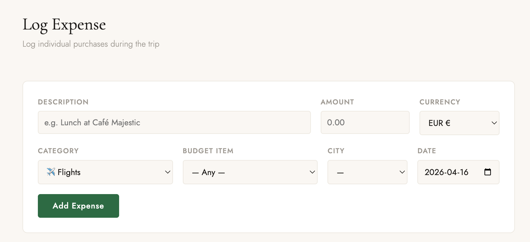 Next, I wanted a way to log actual expenses during the trip. Claude expanded the budget page with a form to record individual purchases, including fields for description, amount, category, budget item, city, and date, with real-time updates. This means I can log expenses on my phone while traveling, and the data stays in my browser via local storage. No backend. No login.