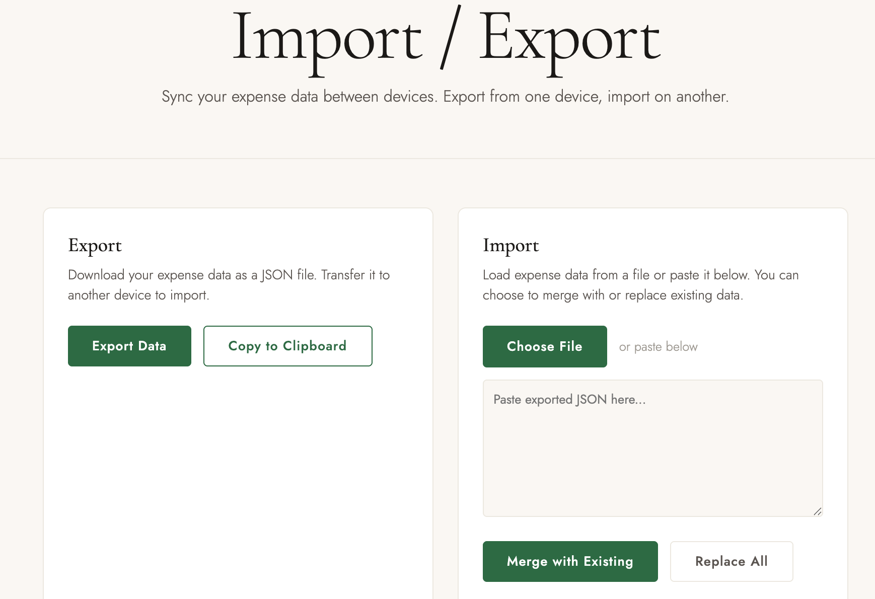 Now that I’m splitting the expense logging form to a separate page, I also prompted it to extract out the Import/Export section into a separate page.
