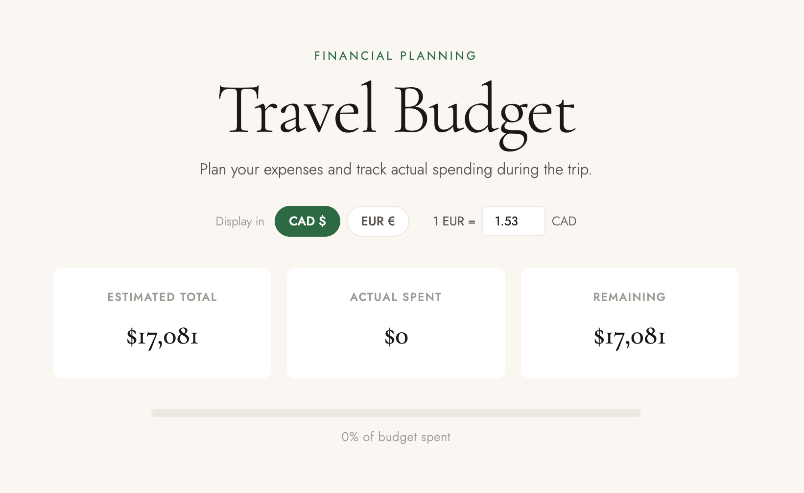 Since the site was initially built for traveling to Portugal, Claude had initially display all the currency in Euro. However, I mentioned that as a Canadian, Canadian dollars is a currency that works better for my brain. I will be entering expenses in Canadian dollars during planning time, but during travel time, I will be entering my expenses on the go in Euro. So I asked Claude to present me some options on how to best handle this.